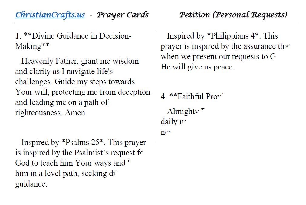 • Each prayer reflects biblical principles that guide personal requests, fostering reliance on God’s wisdom, strength, and provision.