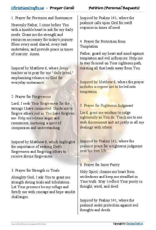 • Each prayer reflects biblical principles that guide personal requests, fostering reliance on God’s wisdom, strength, and provision.