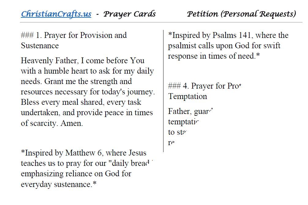 • Each prayer reflects biblical principles that guide personal requests, fostering reliance on God’s wisdom, strength, and provision.