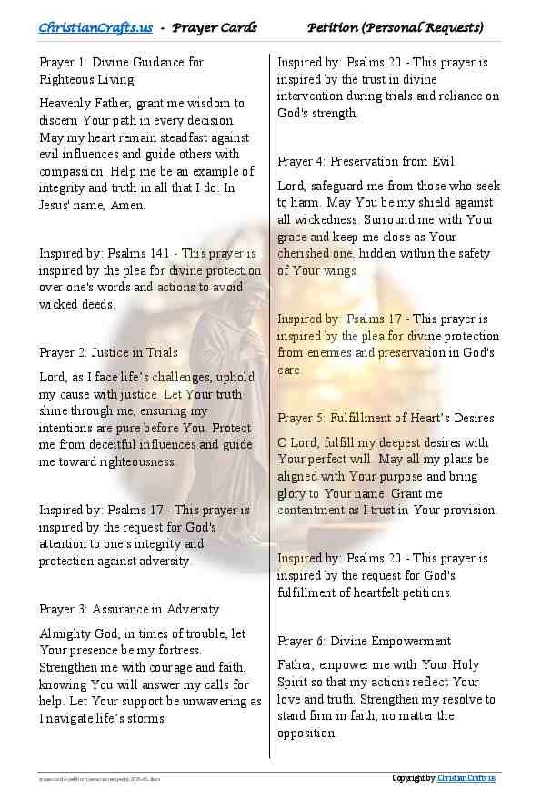 • Each prayer reflects biblical principles that guide personal requests, fostering reliance on God’s wisdom, strength, and provision.