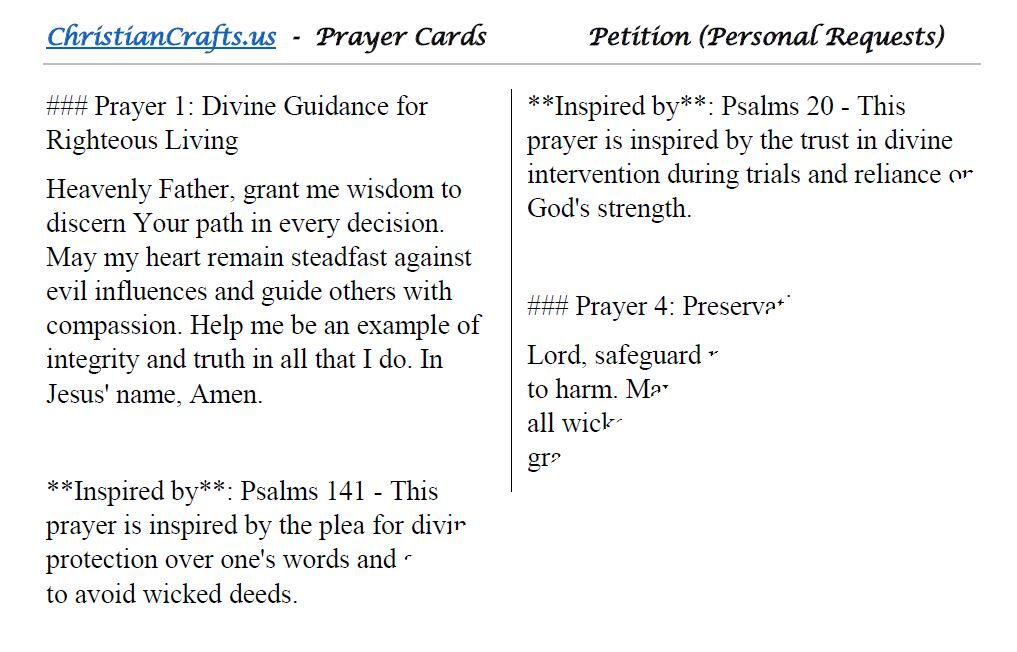 • Each prayer reflects biblical principles that guide personal requests, fostering reliance on God’s wisdom, strength, and provision.